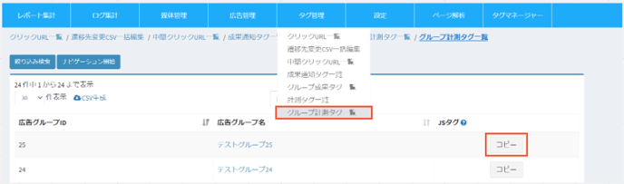 タグ管理>グループ計測タグ一覧より、グループ計測タグを発行してください。