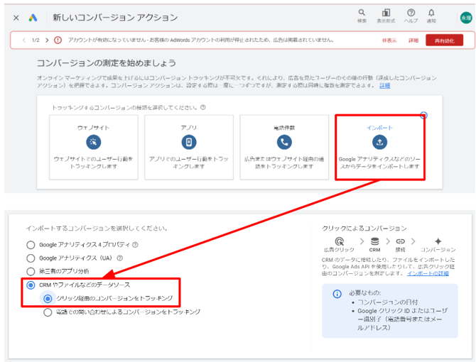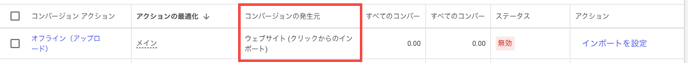 コンバージョンの発生元「ウェブサイト(クリックからのインポート)」が作成できていればコンバージョンアクションの作成は完了になります。