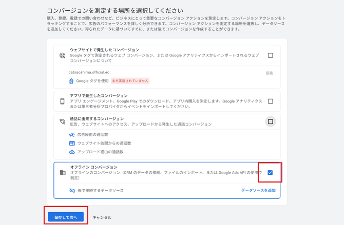オフラインコンバージョンのチェックボックスにチェックを入れて「続行」を選択します。