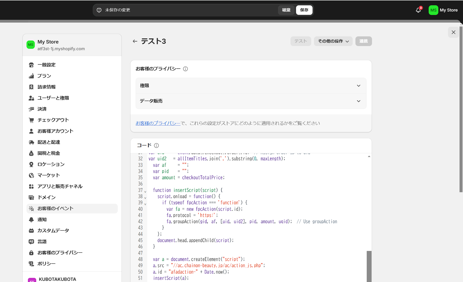 4. Shopify専用成果タグをカスタムピクセルへ設置します。