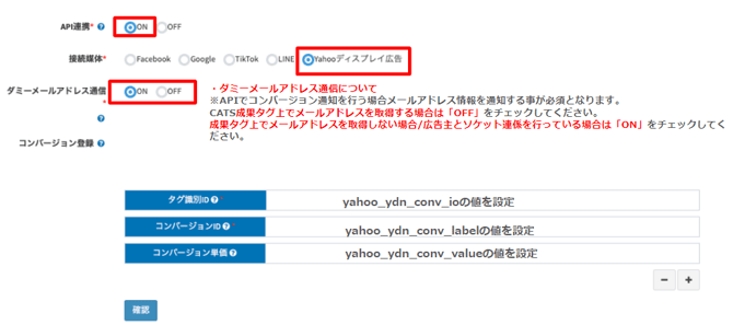 CATS成果タグ上でメールアドレスを取得する場合は「OFF」をチェックしてください。